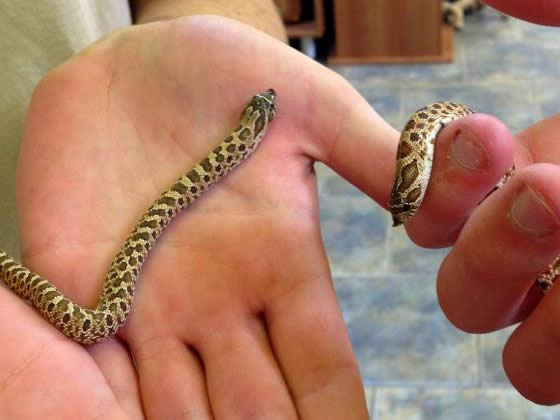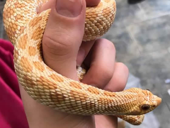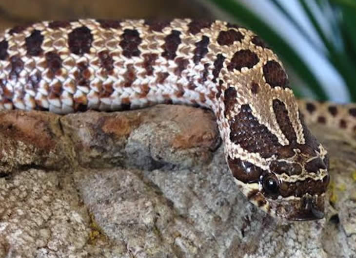 Western hognose is a short snake from the western plains of America. They are well known for the hardened scale at the front of the face used to burrow and manipulate their environment. They have a number of features that differentiates them from other colubrid snakes in the same area. They are technically rear fanged venemous though the venom is very mild and will only cause harm in those that are alergic to the venom. When threatened they will flatten the space directly behind their skull to form a hood much like cobra snakes.