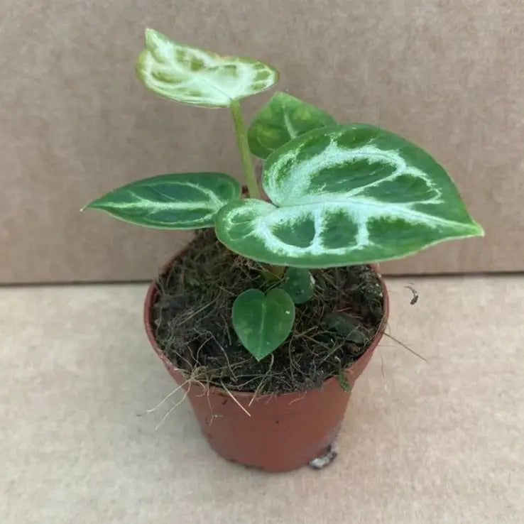 This exclusive cultivar of anthurium boasts impressive, heart-shaped leaves in a variety of deep green shades, adorned with striking light green patterns. As an epiphyte, it naturally thrives when attached to trees, making it an ideal choice for embellishing decorative pieces. Its preference for high humidity also makes it a great addition to terrarium setups. These rare Anthuriums are native to the Caribbean.