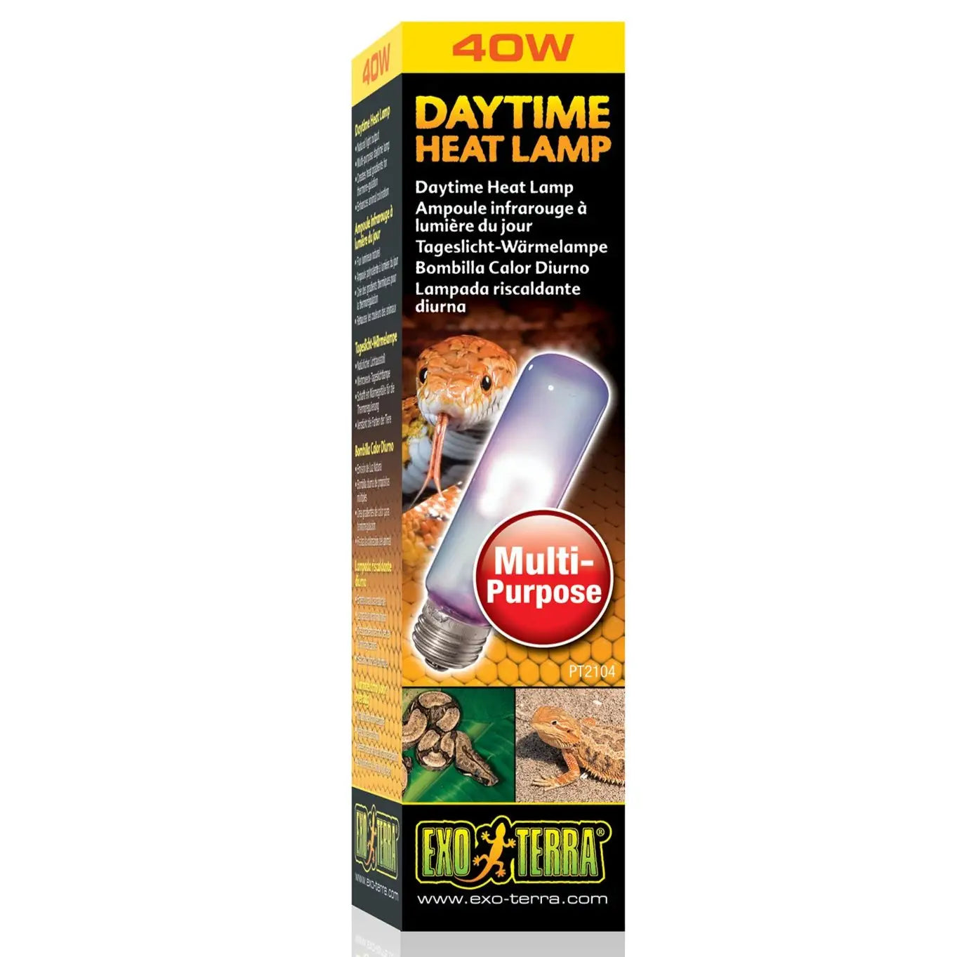 A broad-spectrum daylight lamp with a Neodymium sleeve. The spectrum is ideal for plant photosynthesis and the UVA (ultraviolet A) light contributes to reptiles' physiological well-being. Another important factor is the heat emitted by this bulb which increases the overall ambient temperature in the terrarium.
