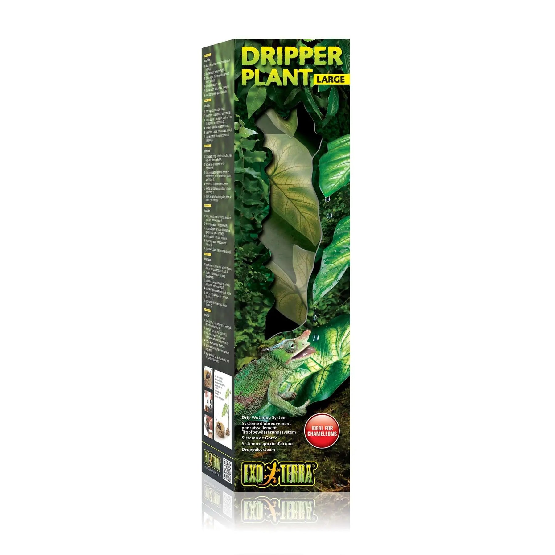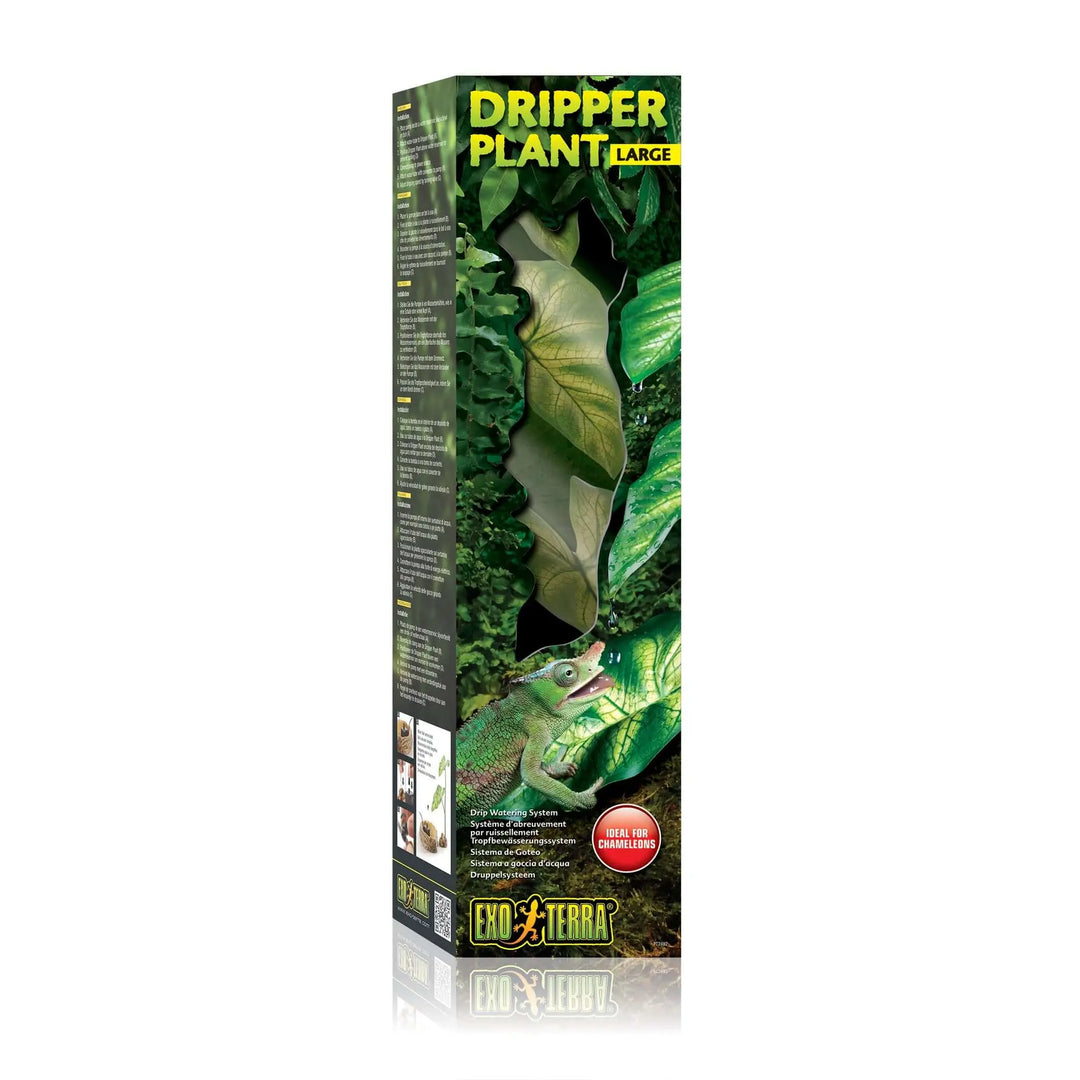 The Exo Terra Dripper Plant is a realistic plant that was designed to meet the watering needs of tree-dwelling reptiles and amphibians like e.g. Chameleons. Arboreal reptiles generally do not recognize motionless sources of water; instead, they drink from moving dewdrops and raindrops while foraging in the forest canopy. The Exo Terra Dripper Plant supplies a continual supply of cascading water droplets, attracting even the most reluctant reptile to drink. Regular access to a recognizable source of drinking water helps prevent illnesses related to dehydration and will improve your animals' overall health.
