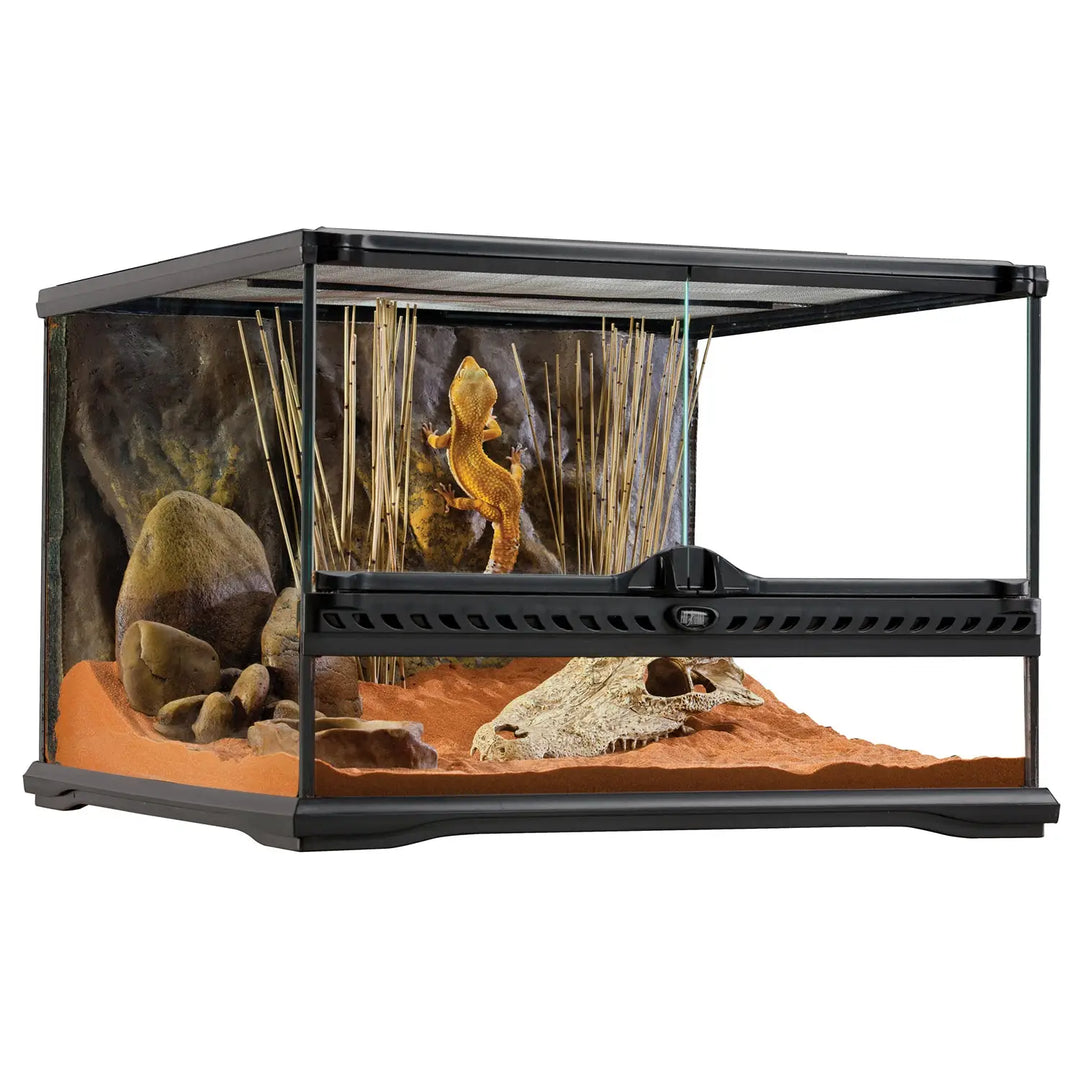 The Exo Terra Glass Terrarium is the ideal reptile or amphibian housing designed by European herpetologists. The front opening doors allow easy access for maintenance and feeding. A specially designed lock will prevent escape and the doors can be opened separately. The full screen top ventilation allows UVB and infrared penetration and is completely removable for easy access while decorating or cleaning. In the back of the screen cover are 5 closable wire or tube inlets on both sides to install Heat Wave Rocks, Waterfalls, sensors, etc. inside the terrarium. The bottom plate of the terrarium is raised to mount a substrate heater to heat a part of the extended ground surface. The extra high fixed front window is ideal for thick layers of substrates (burrowing reptiles), aquatic parts (paludarium) or to mount an Exo Terra reptile den. The natural background is in the same colour like all other Exo Terra decoration items (Water Dishes, Waterfalls, Heat Wave Rocks, etc.) and provides an extra climbing dimension.