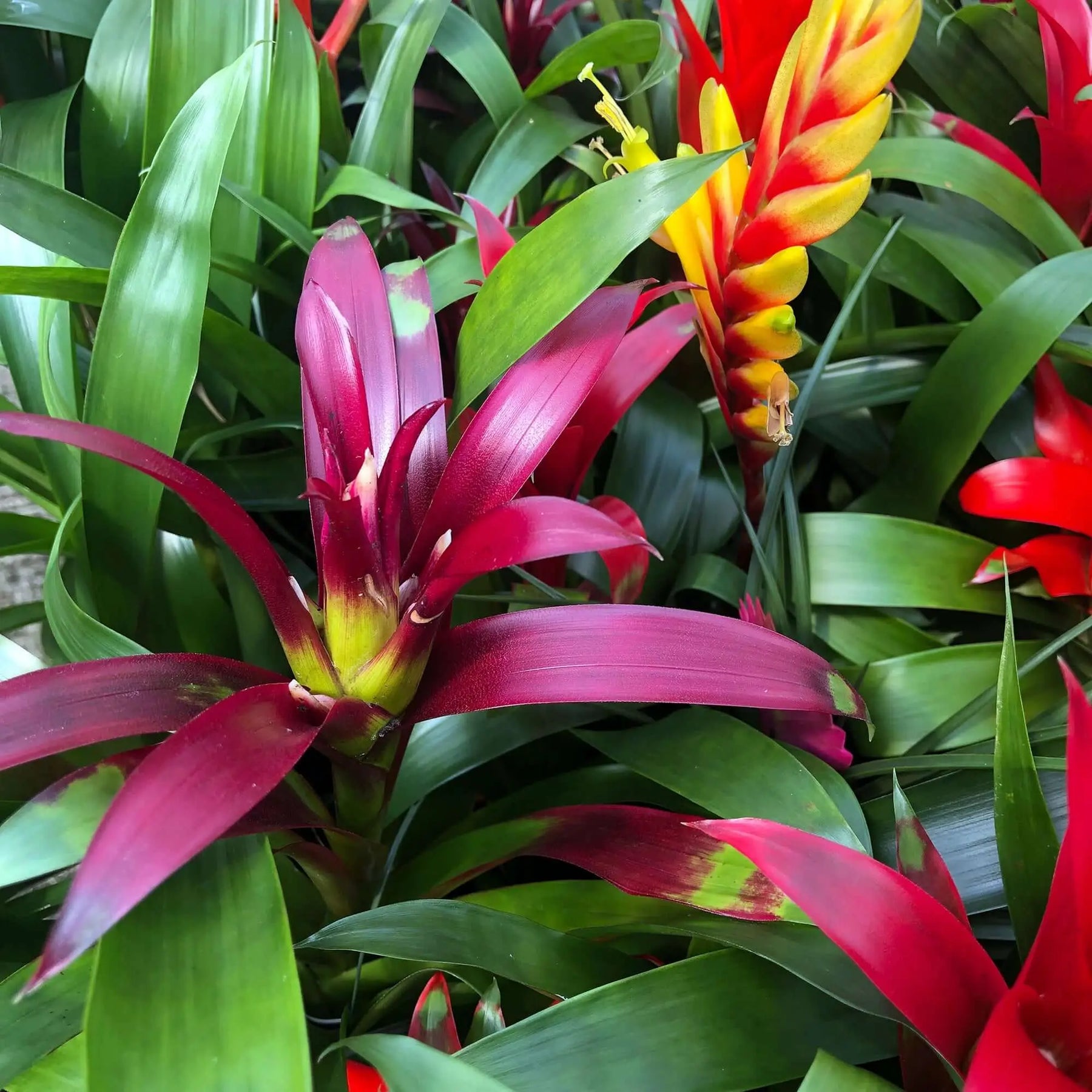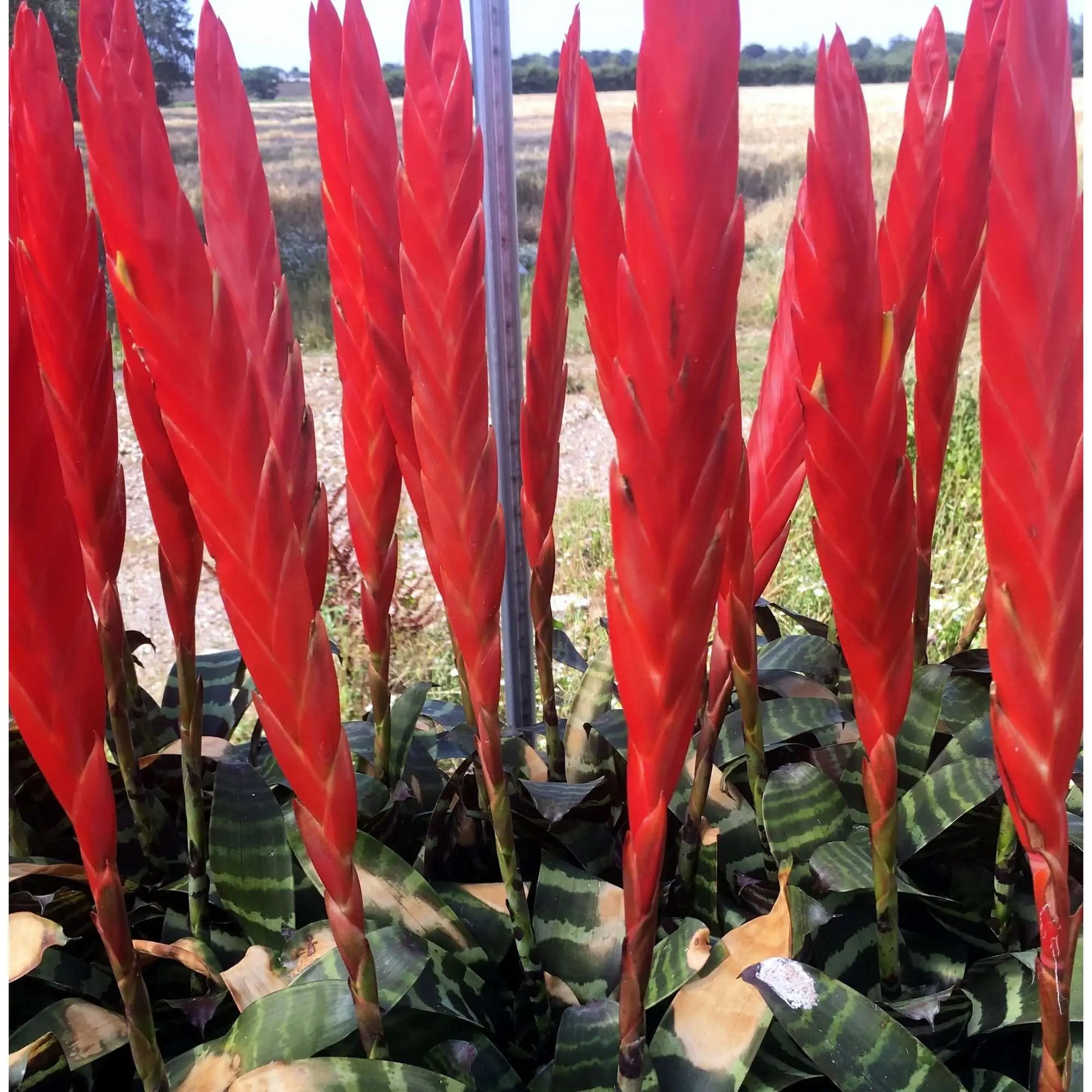 Leathery strap-shaped leaves that are irregularly striped with maroon-green form a funnel-shaped rosette, from which a luminous orange-red, spear-like raceme is jettisoned. The appearance of the flower usually signals the end of the individual rosette, however if you keep it in good conditions, you should soon find new shoots starting to appear from the base to take its place.