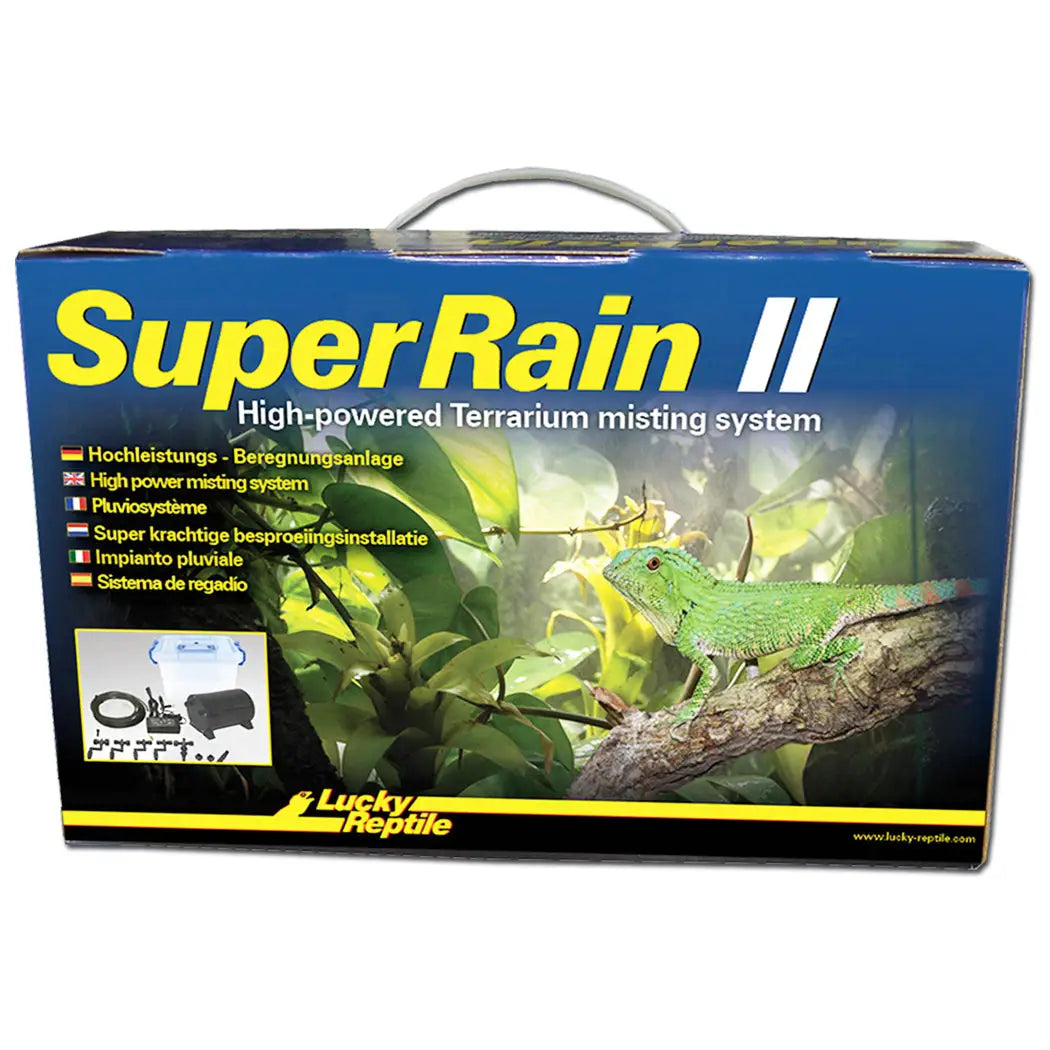 Lucky Reptile Super Rain II is a new and improved version of the Super Rain with a quieter and more powerful pump allowing extension nozzles to be added for larger set-ups. This high-performance mist system has a low-voltage pump that achieves up to 162 L/h and 4.8 bar and can be used with over 15 spray nozzles in single or multiple terrariums.