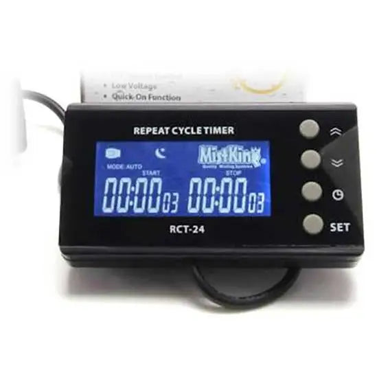 MistKing Repeat Cycle Timer is an ideal choice for aeroponic and other growers that use MistKing misting systems. You can now control misting with separate repeating ON and OFF intervals for day and night. This repeat cycle timer goes beyone flexible. While many other RCT rely on a photo cell to switch from day to night mode, we use the timers internal clock to accurately specify when the switch should occur. This is much more precise. In addition you can configure exact day and night mode starts. RCT-24 can be connected to a 110V or 220V system with no problems.