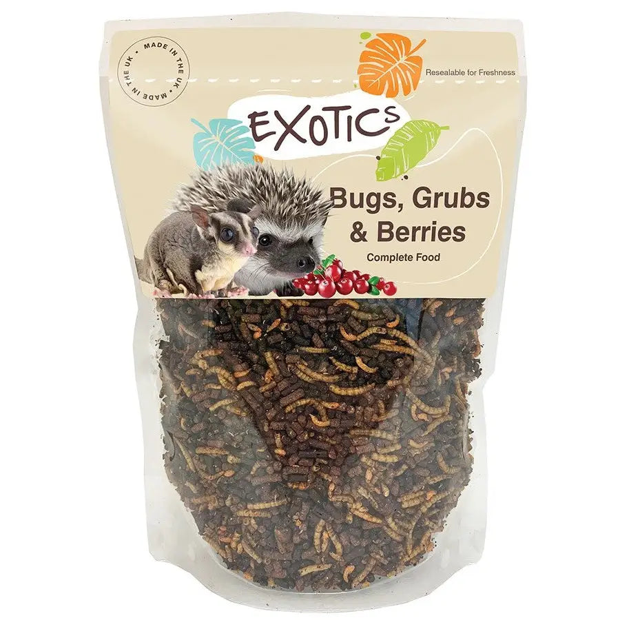 Bugs, Grubs & Berries is a nutritious insectivore diet, loaded with Insects & Blueberries, this diet is designed to add variety to insectivorous mammals diets, this food is suitable for Pygmy Hedgehogs, Sugar Gliders, Opossums, Skunks & insectivorous birds.