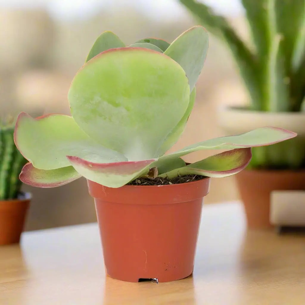 This air-purifying succulent, known as the Paddle Plant 'Red Lips' (Kalanchoe thyrsiflora), features thick, water-storing paddle-shaped leaves and boasts a remarkable ability to change colors. It is a low-maintenance yet visually stunning addition to any space.