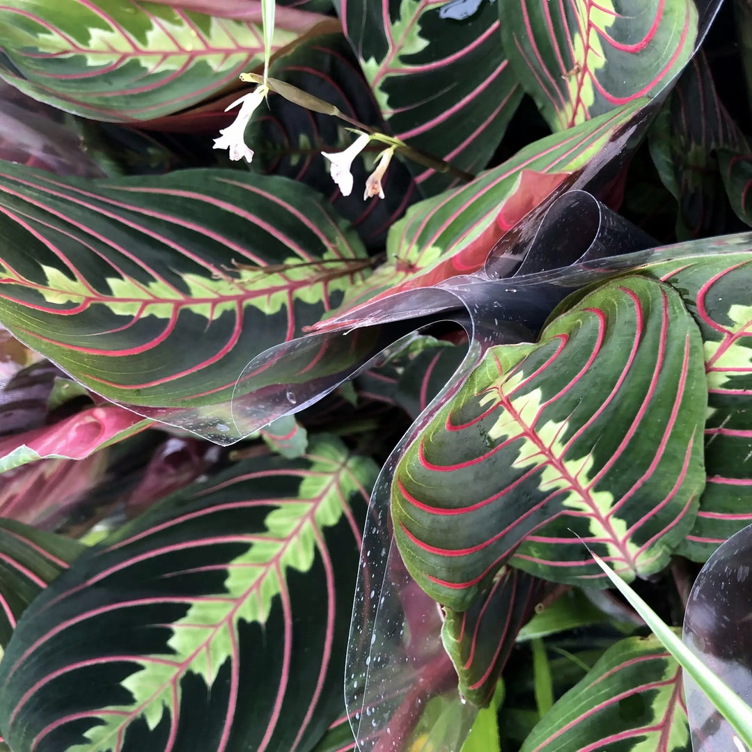 The Prayer Plant is a common houseplant, but in the terrarium it takes on a new lease of life. Thriving in warm, humid conditions in a evenly moist soil it forms clumps of upright leaves and is an ideal background plant. Because it will tolerate shade or bright light then it can be used in many positions, and its attractive variagted leaves, with dark stems, work well when planted with other foliage plants.
