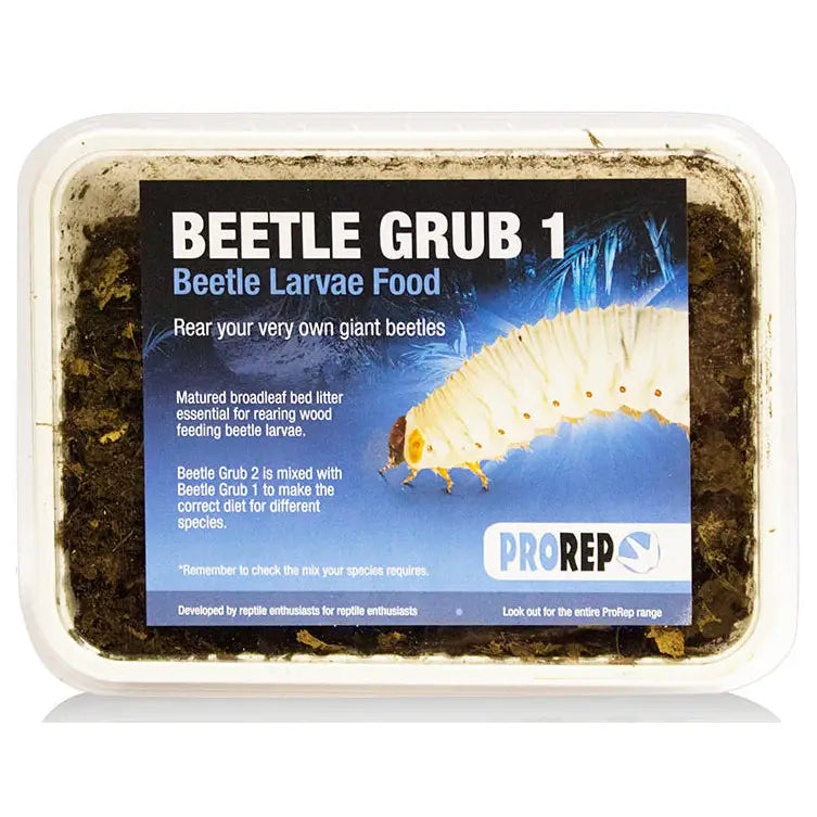 Beetle larvae need very specific food in order to survive. Most important to them is the presence of "white fungus", a special fungus that converts undigestible cellulose and lignin into fungus which the beetle larvae can then eat. ProRep Beetle larvae' food are specially prepared and is infected with the fungus. Beetle Grub 1 is made up of prepared, mature broad leaf tree leaf litter and Beetle Grub 2 consists of hardwood chips infected with the white fungus and allowed to mature. The two types are mixed together in different proportions depending on the species of beetle being reared.